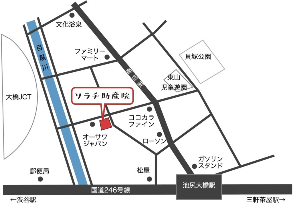 池尻大橋駅東口から国道246号線を背にして商店街を直進ココカラファインさんを左に曲がり直進フードショップ青伸さんをこえて左手角にあるマンションの2階を見上げると、ベランダにソラチ助産院の看板がみえます。マンション1階には「囲炉裏とおばんざい101」さん、「食とか、酒とか、タカノハシアキラ」さん。お隣の建物にはオーサワジャパンさんがあります。
